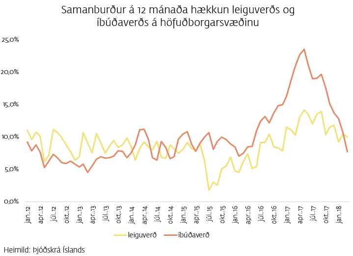 Upp úr miðju ári 2016 fór fasteignaverð á höfuðborgarsvæðinu að hækka hraðar en leiguverð en nú hefur hægt á íbúðaverðshækkunum. Of snemmt er að segja til um hvert leiguverð stefni næstu misseri, en flestir eru sammála um að aukin ró sé að færast yfir húsnæðismarkaðinn.