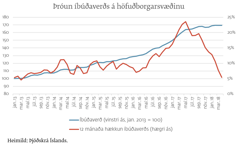 Raunverð íbúða, þ.e. vísitala íbúðaverðs í hlutfalli við vísitölu neysluverðs, var svo gott sem óbreytt milli mánaða í apríl en undanfarna 12 mánuði hefur það hækkað um 3,0%. 12 mánaða hækkunartaktur raunverðs íbúða á höfuðborgarsvæðinu náði tímabundnu hámarki í 21,5% í maí 2017 en síðan síðasta sumar hefur verð íbúða á höfuðborgarsvæðinu lítið breyst að raunvirði.
